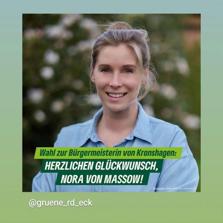 11.06.202411.06.2024 Nora von Massow wurde gestern (9.6.2024) mit 77,4% der Stimmen zur neuen Bürgermeisterin von #Kronshagen gewählt! Als grüner Kreisverband Rendsburg-Eckernförde und grüner Ortsverband Kronshagen wünschen wir Ihr viel Erfolg in […]